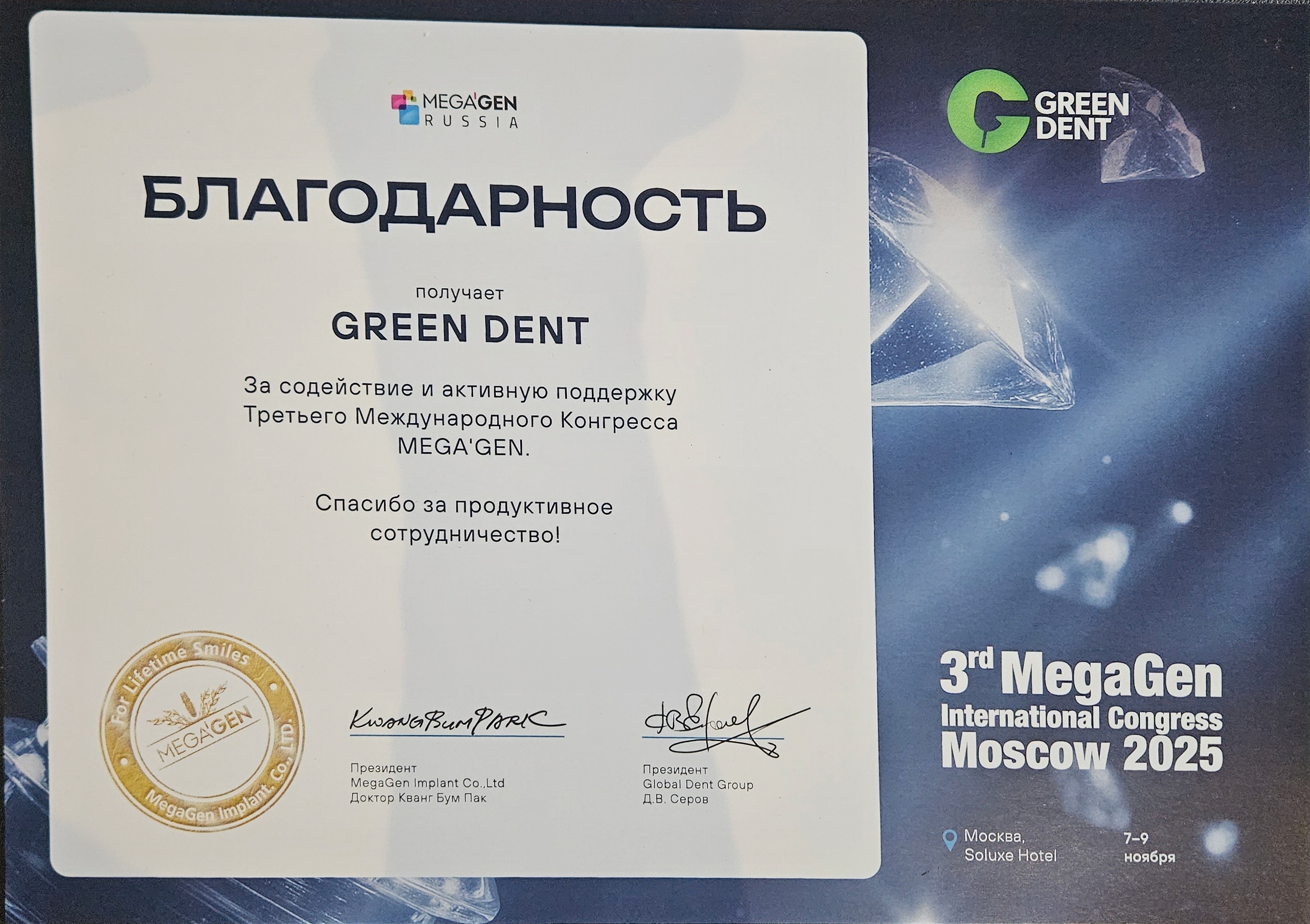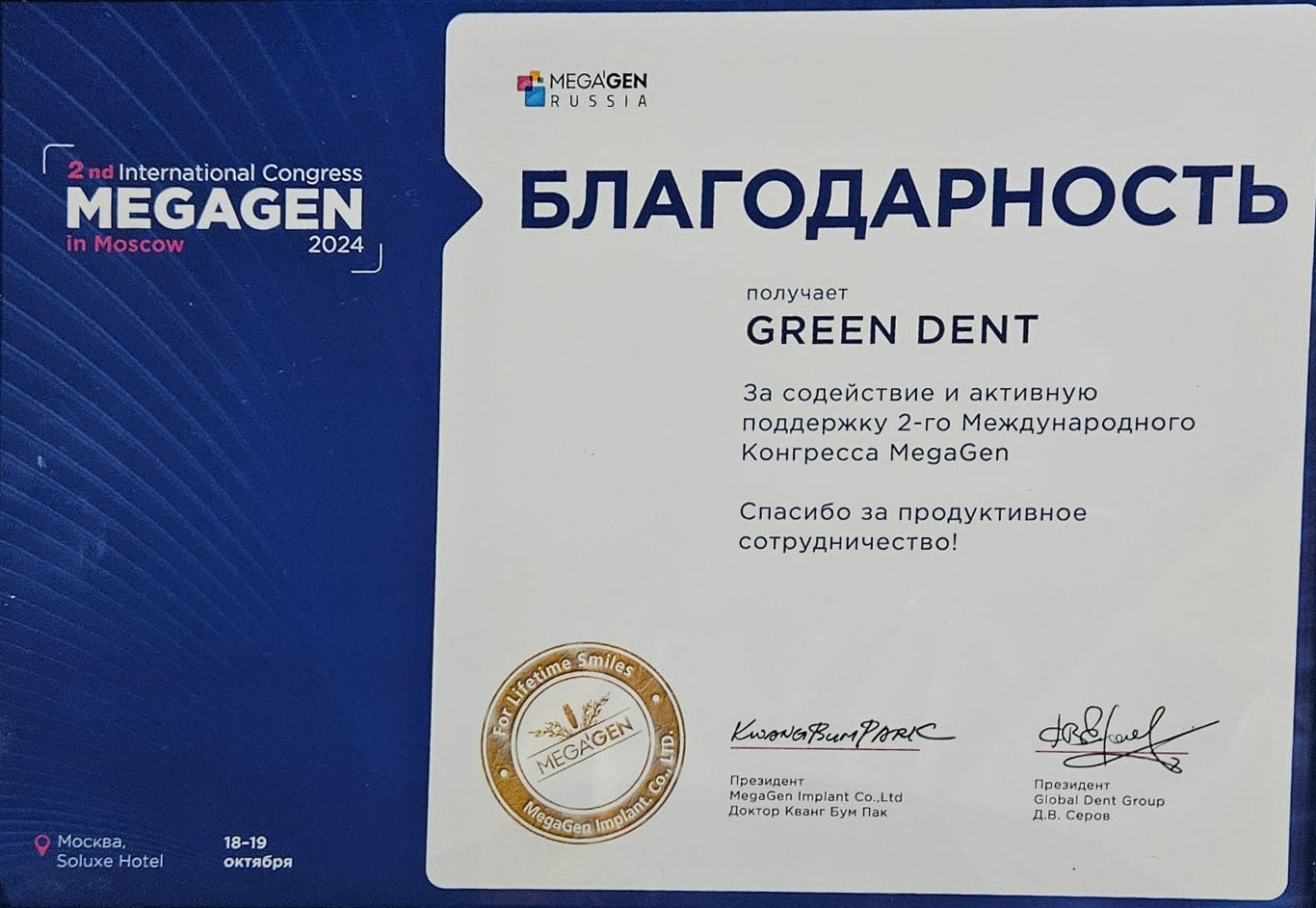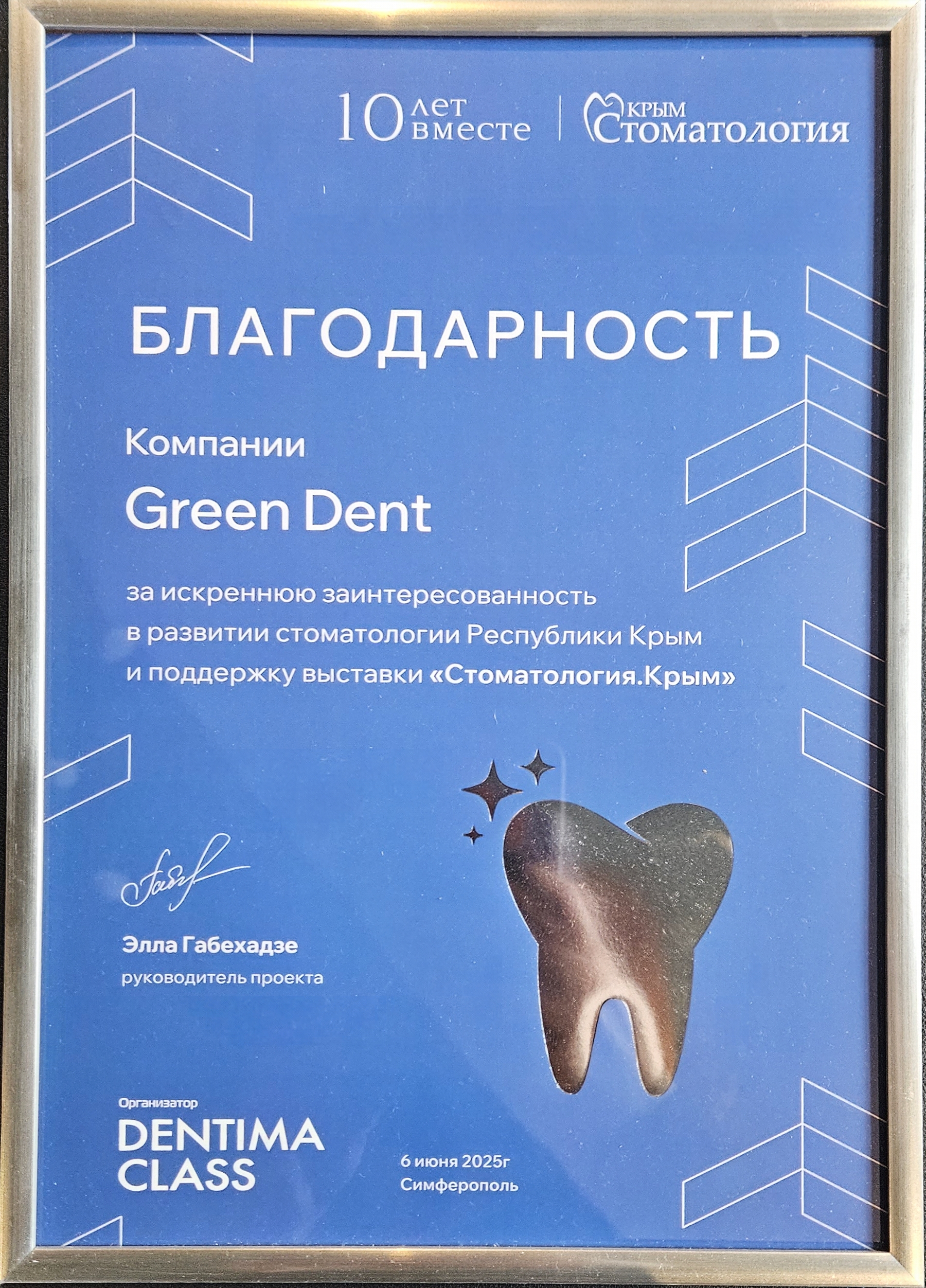 Компания MVK настоящим удостоверяет, что компания GREEN DENT являлась участником выставки «Дентима Краснодар» и была удостоена высокой оценки организатора за актуальность и профессионализм представленной экспозиции.