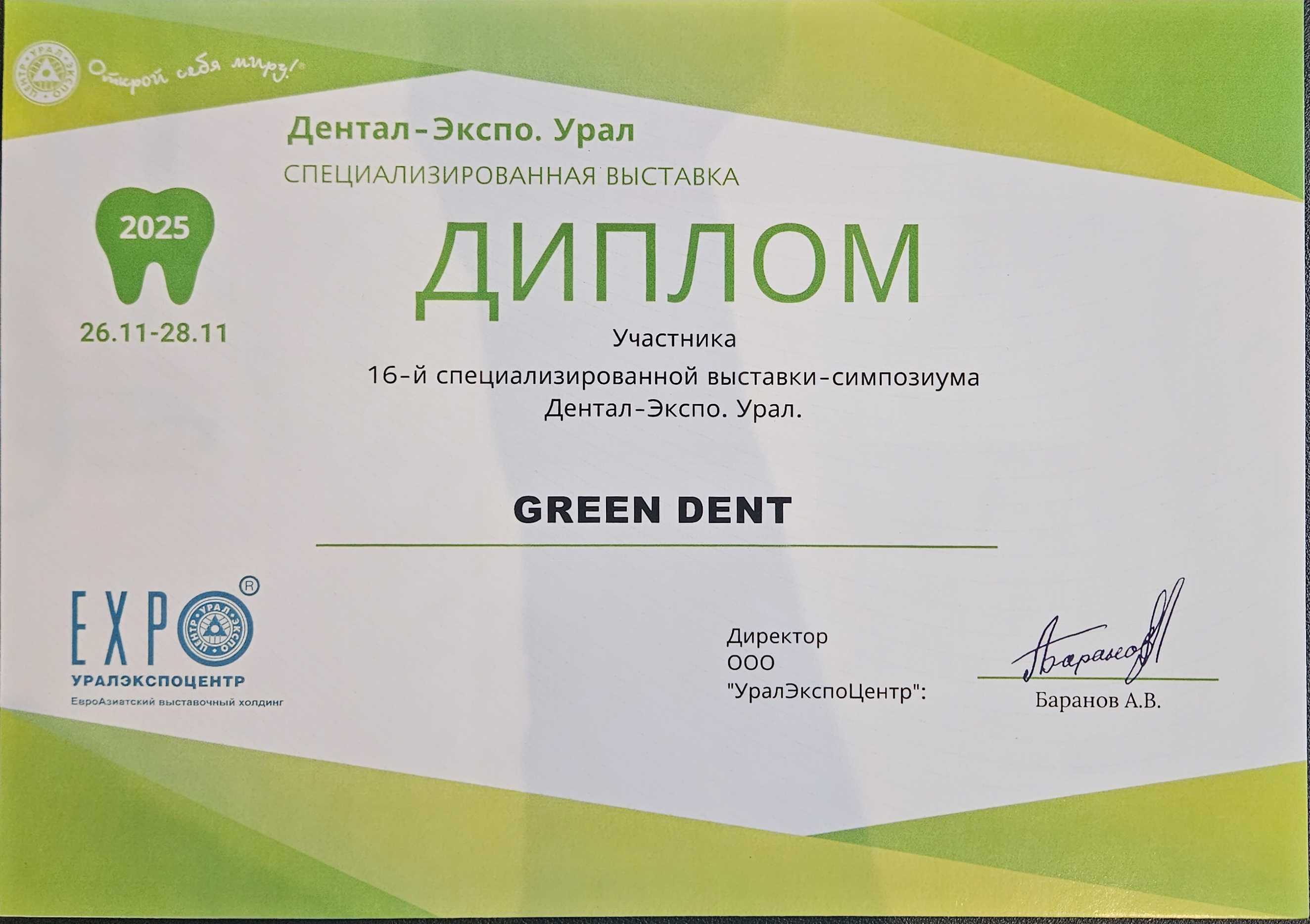 Диплом GREEN DENT за высокое качество и новизну продукции